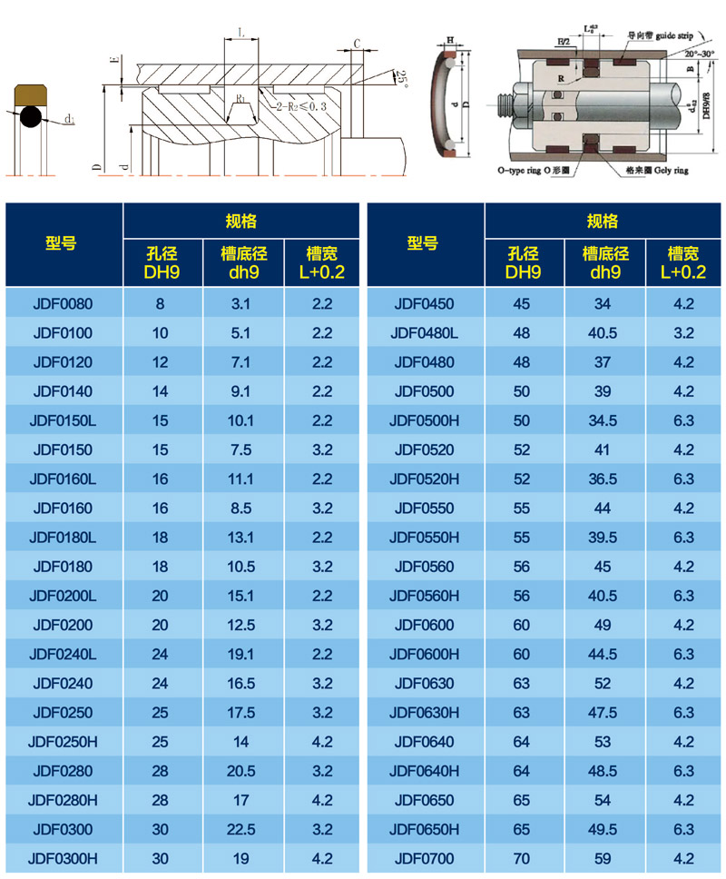格萊圈由一個(gè)橡膠O型圈及聚四氟乙烯圈組合而成。〇型圈施力,格萊圈為雙作用活塞密封。摩擦力低,無爬行,啟動(dòng)力小,耐高壓??煞譃榭子酶駚砣洼S用格來圈。