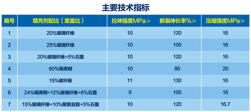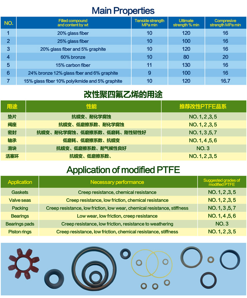 改性聚四氟乙烯制品選用填充聚四氟乙烯樹脂經(jīng)模壓、車削加工而成。懸浮聚合聚四氟乙烯樹脂與各種填充劑經(jīng)高速混合得到改性樹脂。適合與聚四氟乙烯混合的填充劑有高目數(shù)玻璃纖維、碳纖維、銅粉及潤滑劑(石墨、二硫化鉬等),其已在生產(chǎn)中廣泛應(yīng)用。同傳統(tǒng)聚四氟乙烯相比具有更高的壓縮強度、耐磨性、導(dǎo)熱性和抗蠕變性等諸多優(yōu)點。